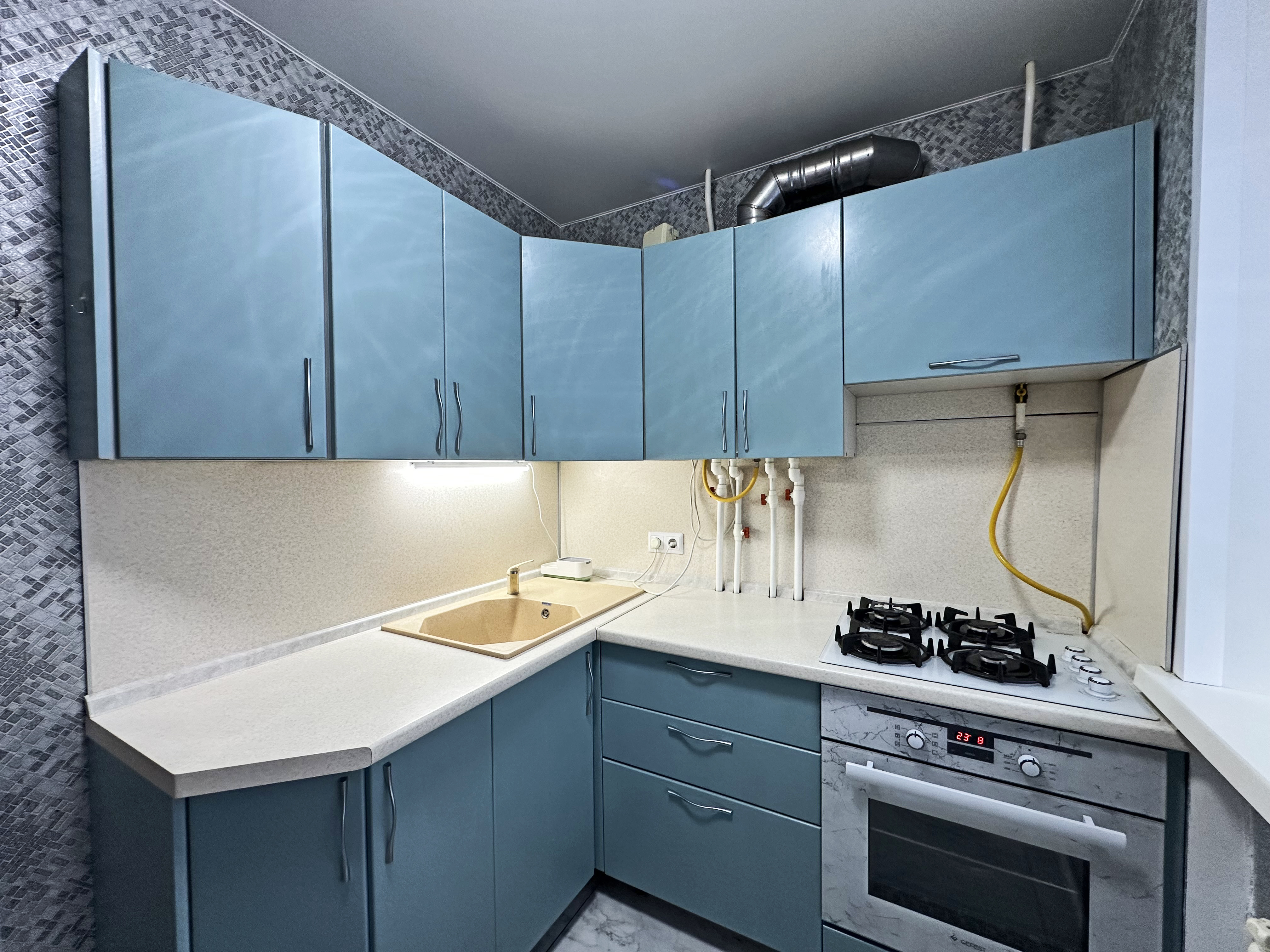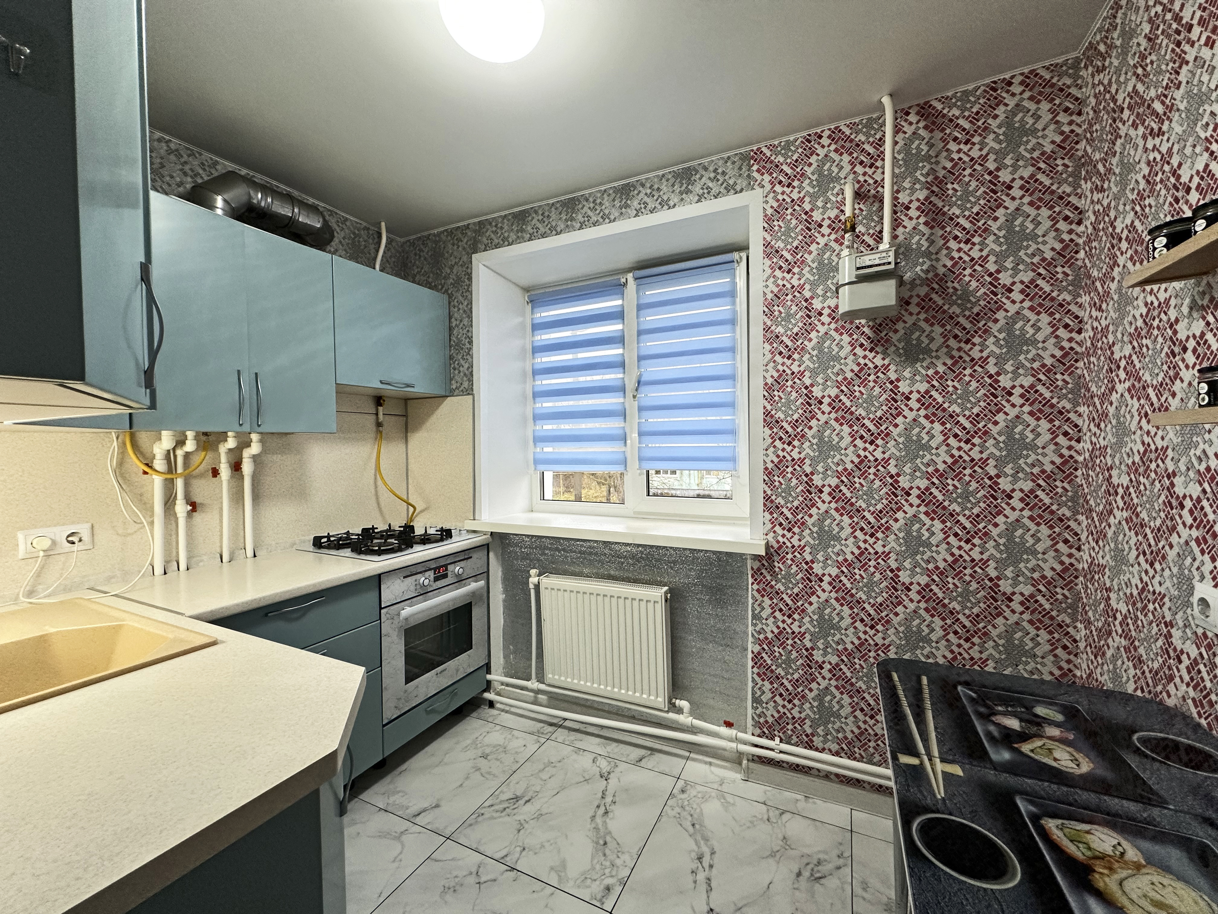 Остаётся вся крупная техника, кухонный гарнитур с встроенной поверхностью и духовым шкафом.